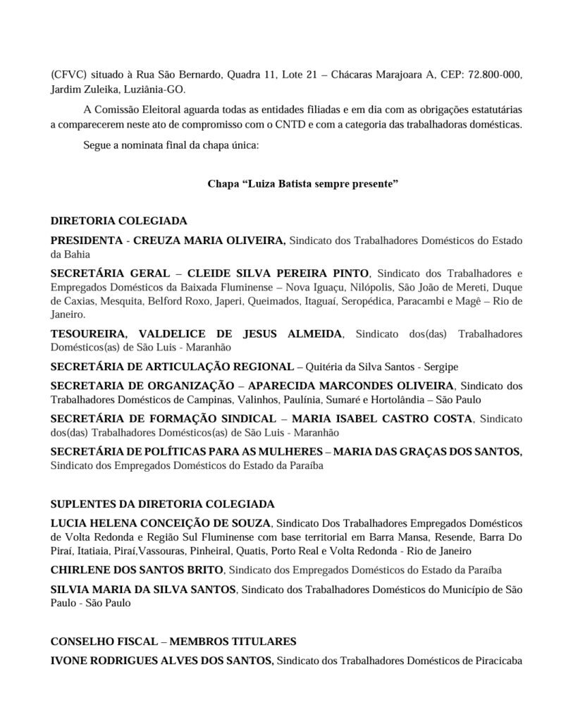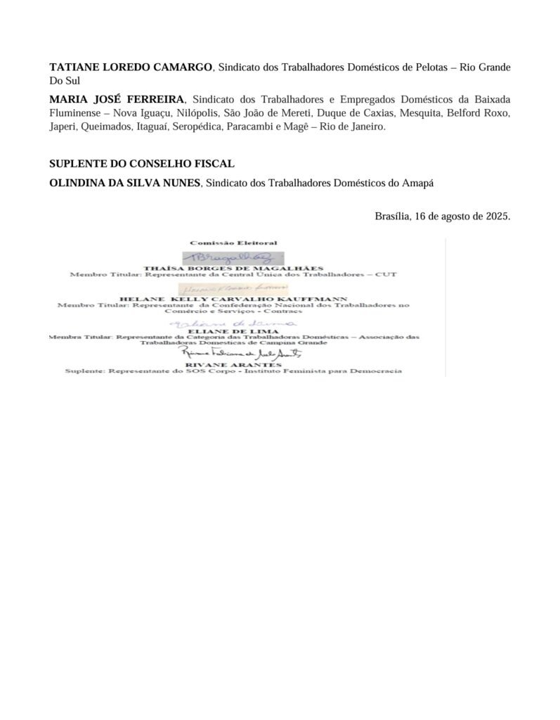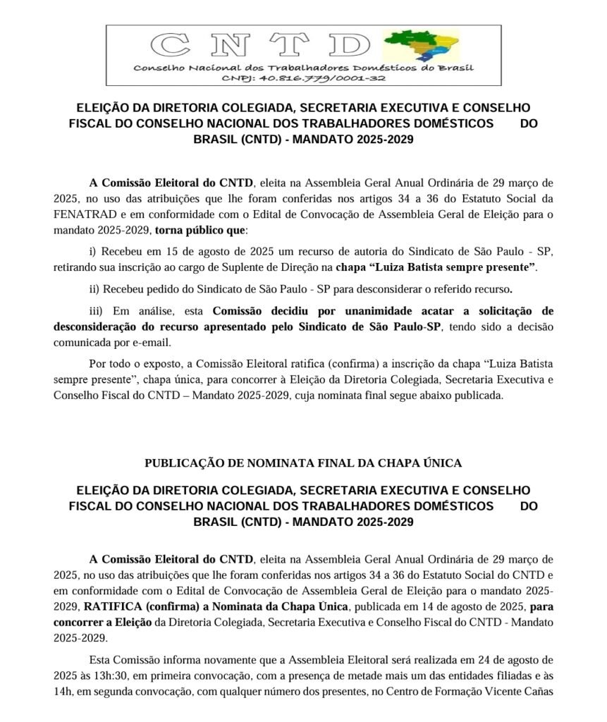 Notícias Gerais Confira a publicação da nominata final da chapa única – Eleição da Diretoria Colegiada, Secretaria Executiva e Conselho Fiscal do Conselho Nacional dos Trabalhadores Domésticos do Brasil (CNTD) – mandato 2025-2029 Compartilhe esta notícia: